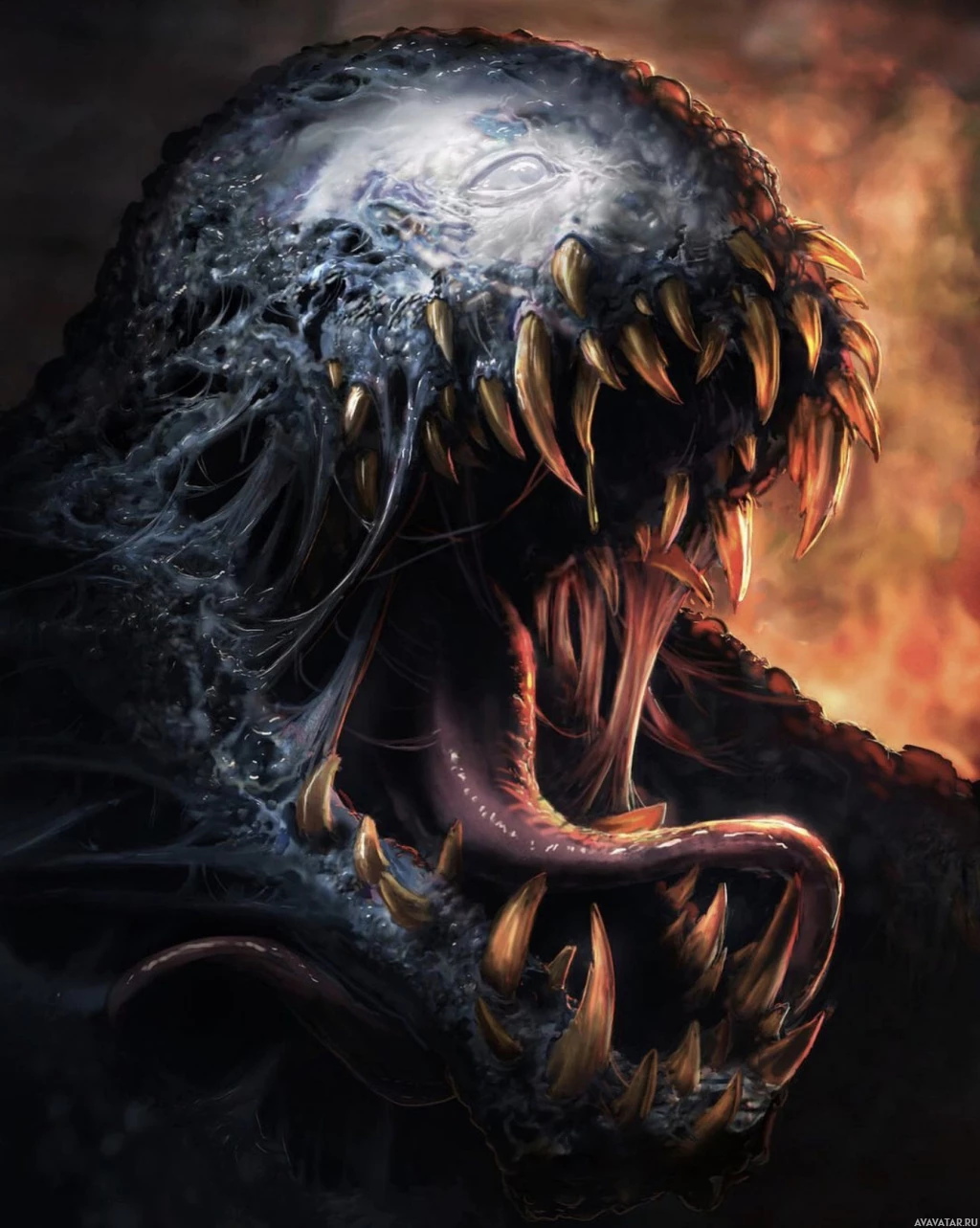 На картинке изображен персонаж, напоминающий Венома из комиксов и СМИ. На нем изображен персонаж с преувеличенным выражением лица, демонстрирующий острые зубы, на огненном фоне, что создает напряженную, мрачную атмосферу.