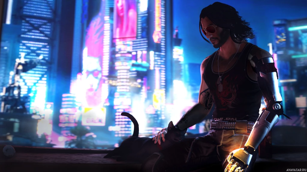 a cat in the foreground that seems to be looking back at him. The background shows a futuristic cityscape with