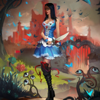 the classic Alice. The background features an eerie landscape with a castle ruin on the left side and
