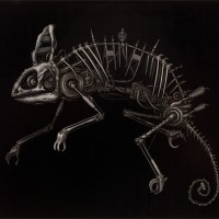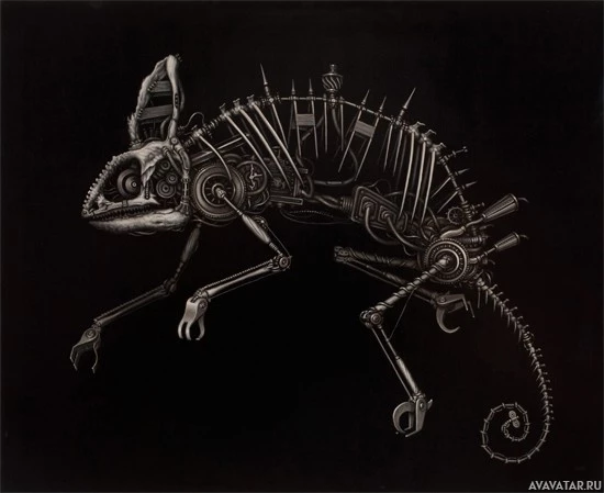 a fantastical creature that resembles a chameleon. The image is rich in detail and suggests a theme of technology and nature co-existing, possibly commenting on the integration of