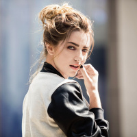 fashionable attire with a jacket and a top that has some lace or embroidery on the sleeves. Her hair is styled in an up-do, which adds