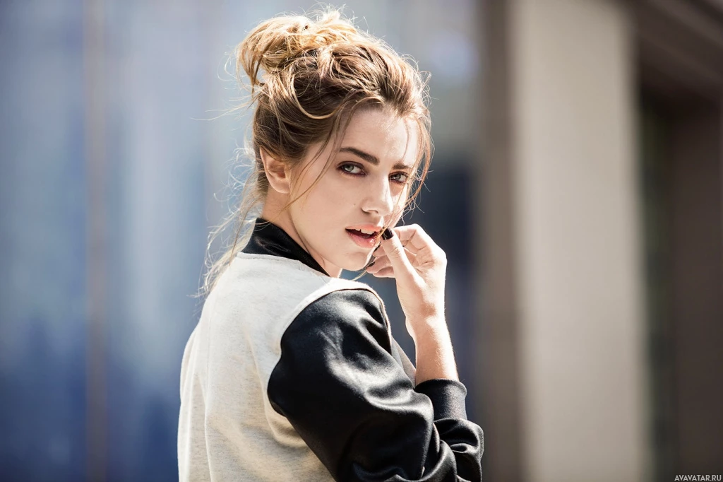 a chic touch to her overall look. The background suggests an urban setting, possibly during