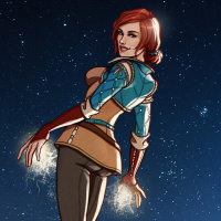 sky backdrop with stars visible. The character is well-known for her complex relationships within the game's universe and her role as a sorceress and ally to the protagonist