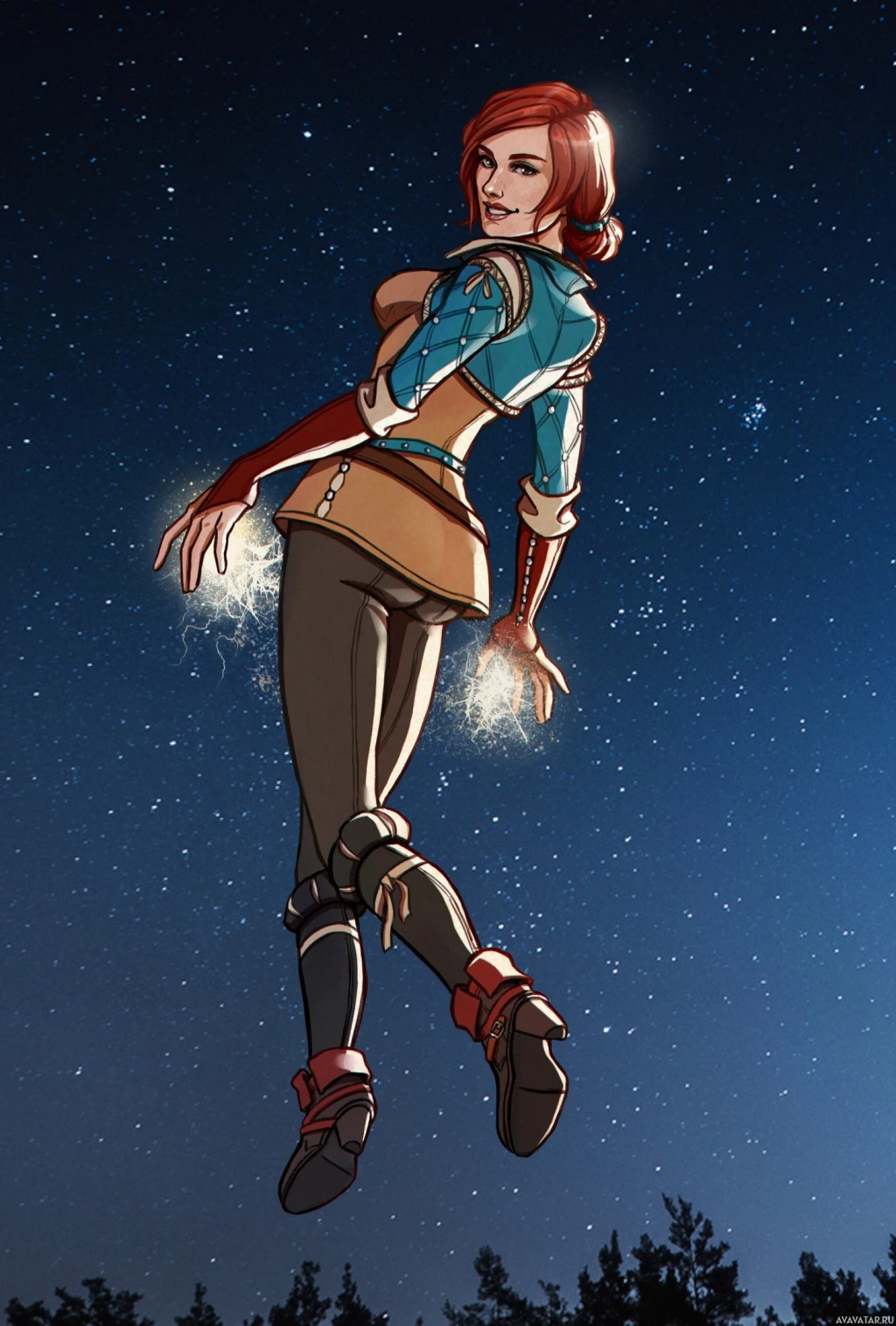 blonde hair and red attire, which includes a blue coat over a yellow dress. Triss appears to be mid-jump or performing some sort of action that makes her appear weightless, set against a night