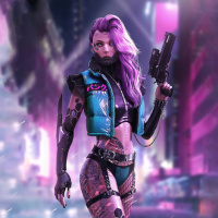 На картинке изображен женский персонаж, который, похоже, является персонажем научной фантастики. У нее фиолетовые волосы и она одета в футуристический наряд, который включает в себя такие элементы, как броня и высокотехнологичный наряд с тактическим жилетом. В руках она держит что-то похожее на пистолет или похожее оружие. На заднем плане изображена городская среда, освещенная неоновыми огнями, что наводит на мысль о развитом городском пейзаже, типичном для научно-фантастических рассказов.