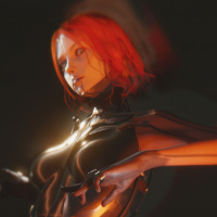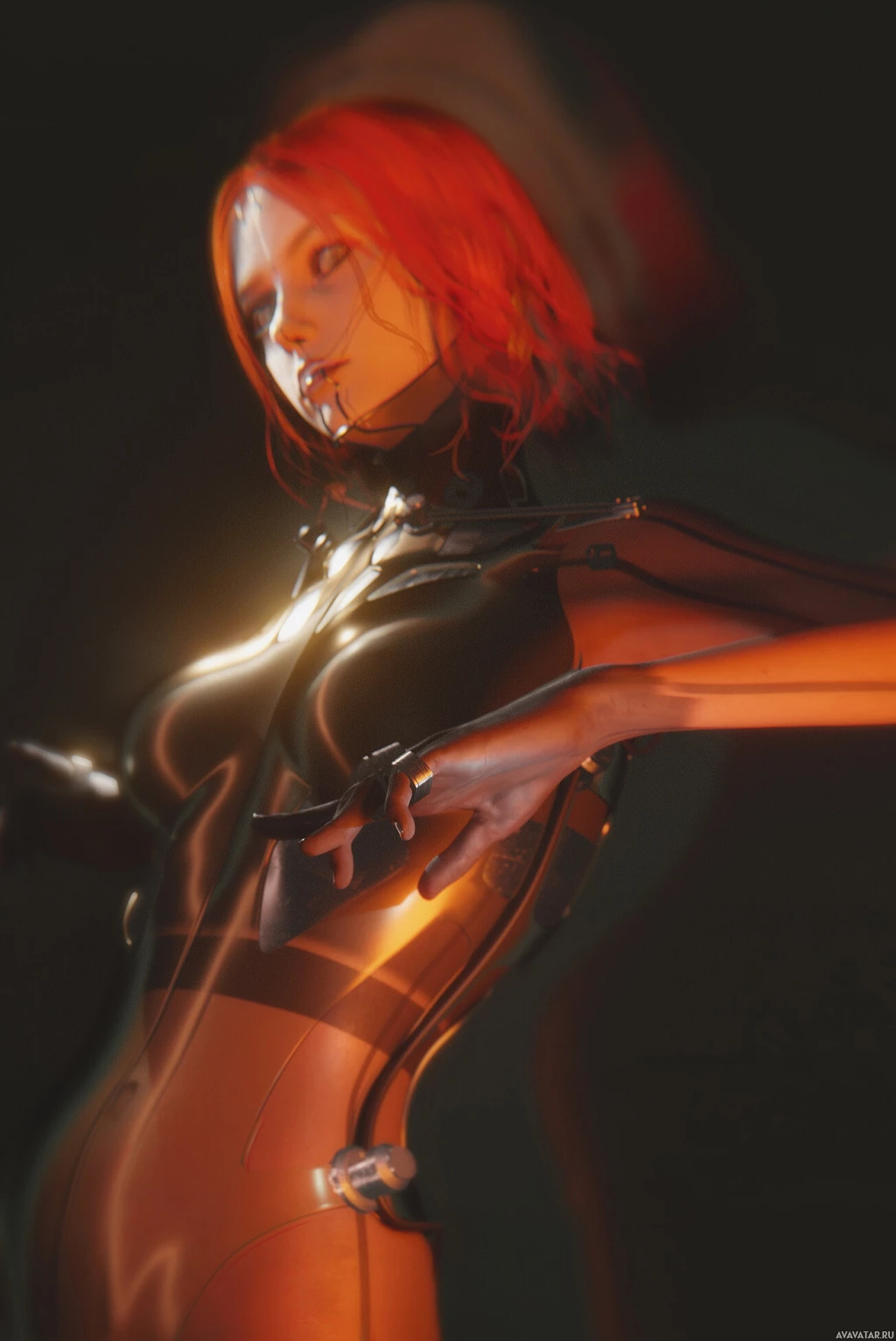 red hair. She is depicted in a fantasy or sci-fi setting, possibly wearing some