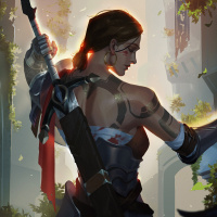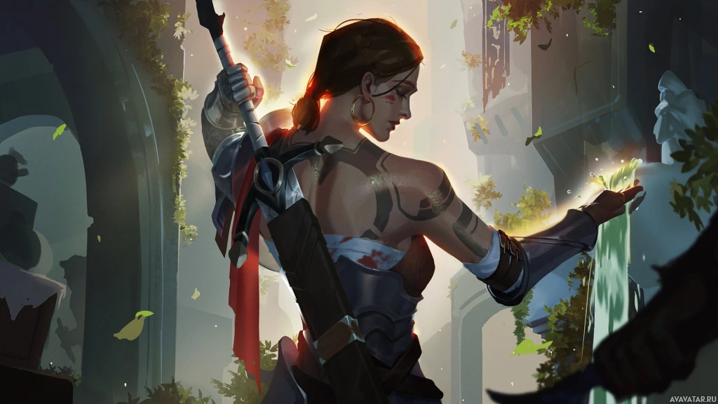 brown hair, which is styled with an accessory that might be part of her armor. She is holding a sword in one hand, and there are elements that suggest she might be surrounded by nature, possibly within an ancient or mystical setting. The image conveys
