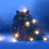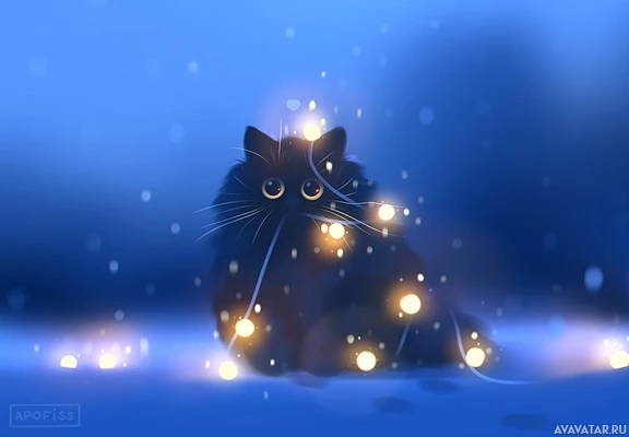 На картинке изображена черная кошка, сидящая на чем-то, напоминающем заснеженную землю. Вокруг кошки горят маленькие огоньки, напоминающие искры или звезды на ночном небе. Это создает причудливую и волшебную атмосферу вокруг кошки.