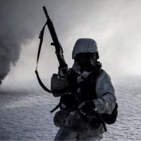 an arctic environment, likely during wartime or training for such conditions. The soldier is wearing cold-