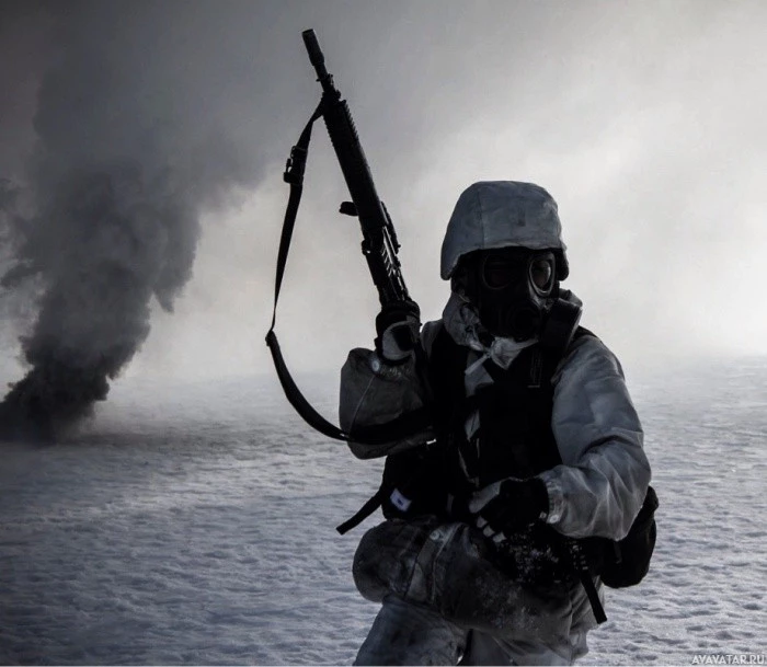 weather gear and has a helmet with a respirator system, which suggests the presence of hazardous air quality due to either natural sources like frozen methane or man-made ones like chemical weapons. They are holding a rifle with a bayonet attached, indicating readiness for combat. The environment is icy and barren, indicative of