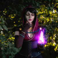 dark hair styled similarly to Morrigan's, and they are holding a staff that appears to be a magical wand or focus for magic. The setting seems to be an outdoor area with greenery, possibly a park or