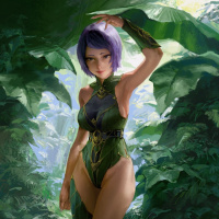 The image depicts an illustrated character with purple hair, standing among foliage that resembles a jungle or rainforest setting. She is wearing what appears to be a fantasy-style armor or costume, which gives her an adventurous and heroic appearance. Her pose suggests she is in the midst of an outdoor exploration or adventure.