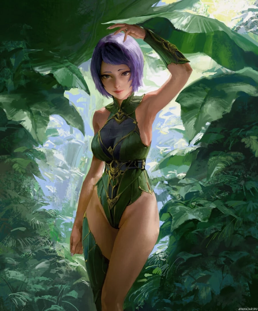 На картинке изображен персонаж с фиолетовыми волосами, стоящий среди листвы, напоминающей джунгли или тропический лес. На ней надето что-то похожее на доспехи или костюм в стиле фэнтези, что придает ей авантюрный и героический вид. Ее поза говорит о том, что она находится в самом разгаре исследования или приключения на свежем воздухе.