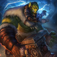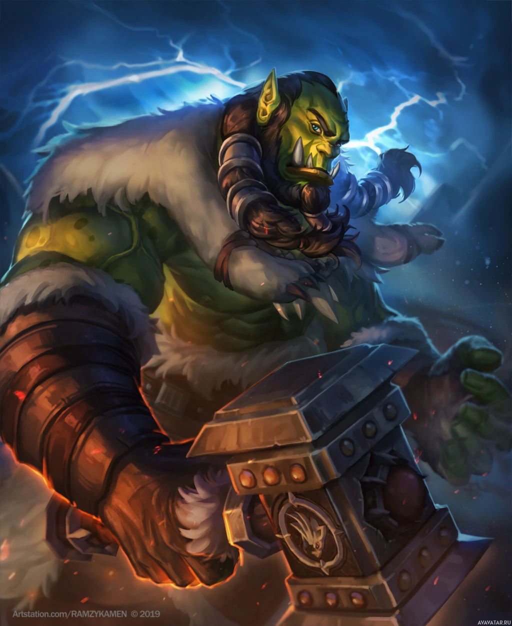a fantasy setting, holding a weapon that resembles a hammer with a spiky head, which is characteristic of the iconic item known as "Thunderfury" in the game. The background gives off a dramatic atmosphere with