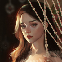 a delicate necklace or headband that features pearls or similar beads. The background is softly lit and suggests
