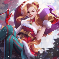 pointed ears and a cheerful expression. She is dressed in festive attire that includes a red and white outfit with a cape, accessories like
