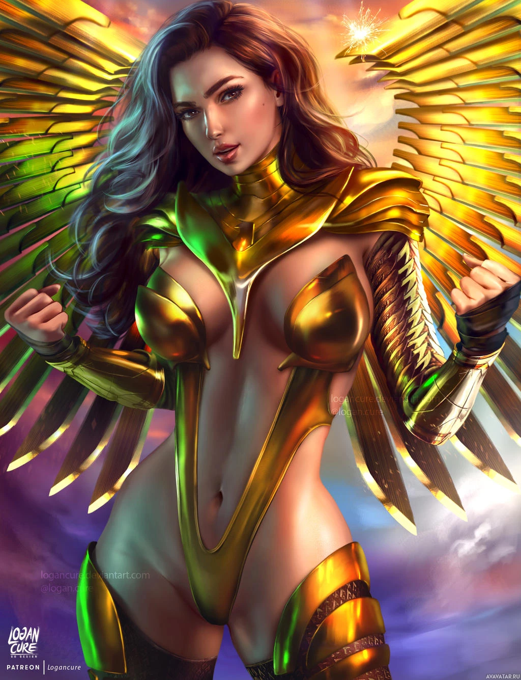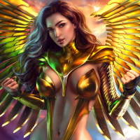 angelic mythology. She has wings, which are commonly associated with angels in various religious and fantasy traditions. The character is wearing armor or body armor with