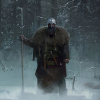 forested landscape during winter. At the center of the composition is an older warrior-type figure dressed in heavy armor and a cape that looks like fur, suggesting it could be from a historical or