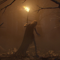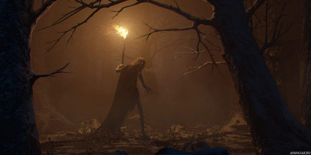 misty forest at night. There's a torch providing illumination to