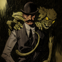 На картинке изображен мужчина в костюме, стоящий на темном фоне. На нем фетровая шляпа и усы. Позади него находятся два чудовищных существа, напоминающих зверей с щупальцами, одно из которых, кажется, висит на спине человека, как будто он его несет. Художественный стиль напоминает жанры ужасов или научной фантастики.