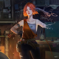 a female character with red hair, wearing a sleeveless brown top. She appears to be in an industrial or workshop setting, with various tools and equipment around her, including pipes, wires, and what looks like