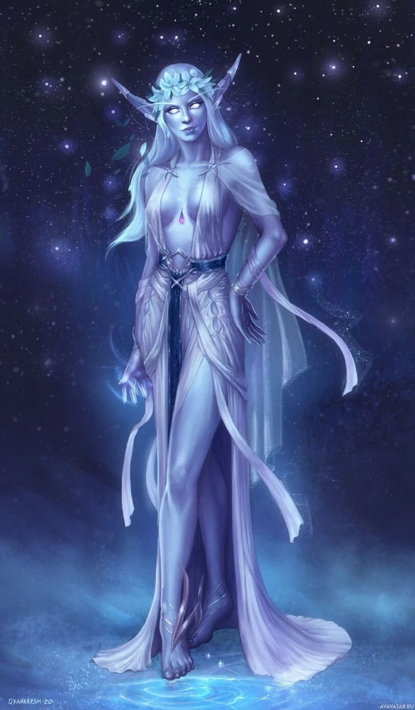 На картинке изображен персонаж, похожий на сказочного эльфа. У этого эльфа длинные белые волосы, и он одет в нечто, напоминающее магический наряд, что наводит на мысль о его роли в фантастических или магических сценах. На заднем плане изображены звезды и другие небесные элементы, что еще больше подчеркивает магическую тематику изображения.