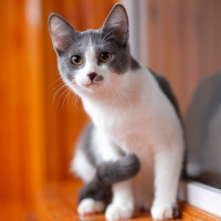 На картинке изображен маленький серо-белый котенок, сидящий на подоконнике. Кажется, что он с любопытством или, возможно, с вниманием следит за чем-то за пределами кадра, поскольку смотрит вверх широко открытыми глазами.