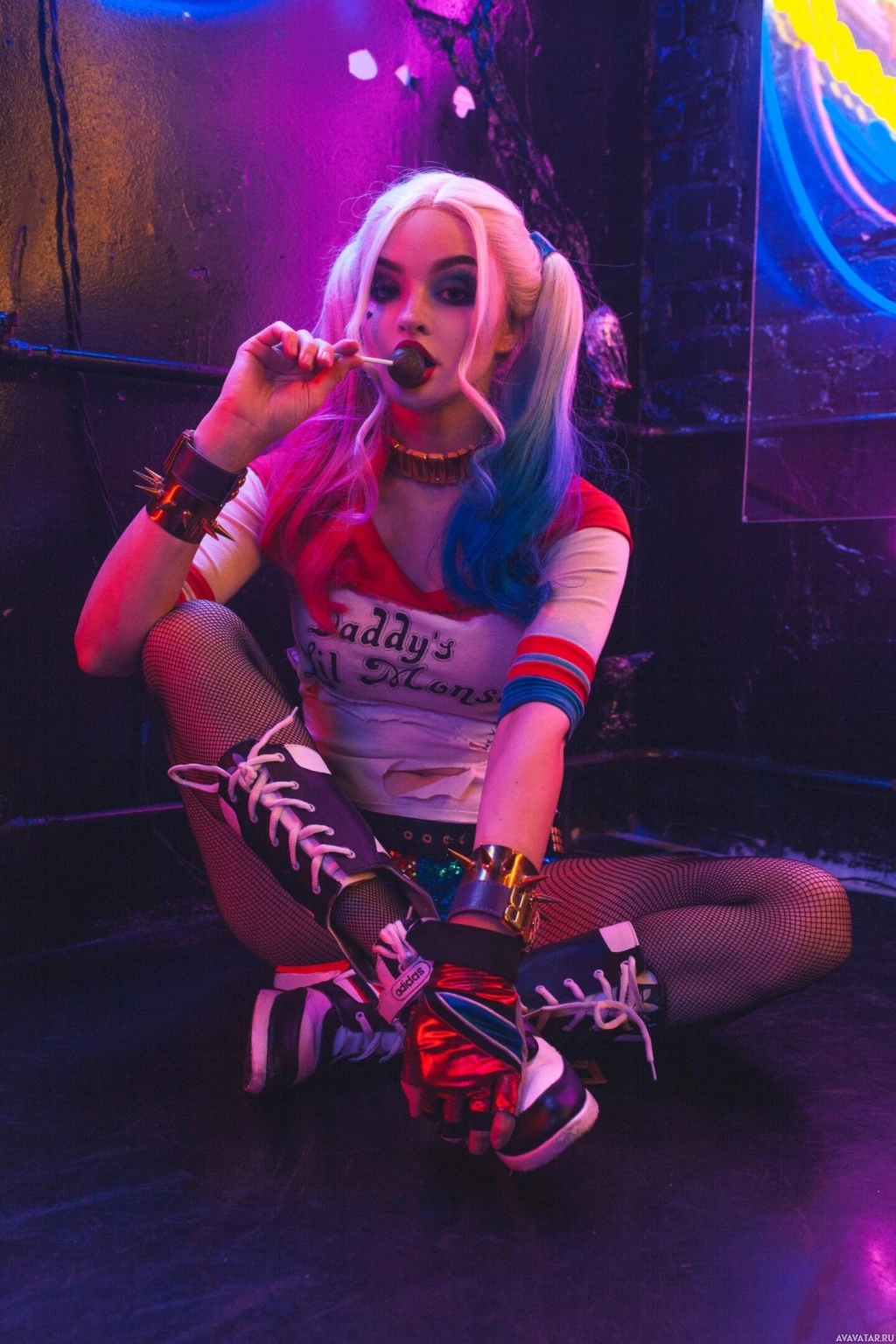 iconic outfit consisting of a red and blue jester-like costume with shorts, white face paint, and an exaggerated smile. The individual appears to be in a room that looks like a club or a similar