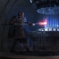 a control room or a workshop due to the presence of consoles and various technical equipment. The character's attire and gear suggest they might be part of a specialized unit or squad within the Star Wars universe, consistent with their role as