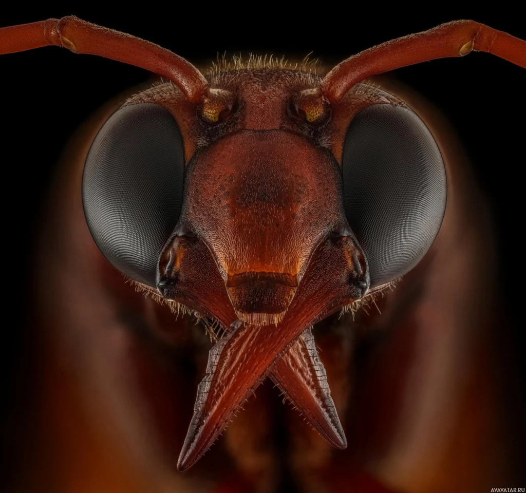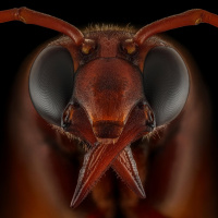 compound eyes. The colors range from dark brown to red, and the wings are folded close to its body. This is characteristic of many wasps as they can have brightly colored bodies.