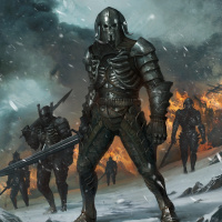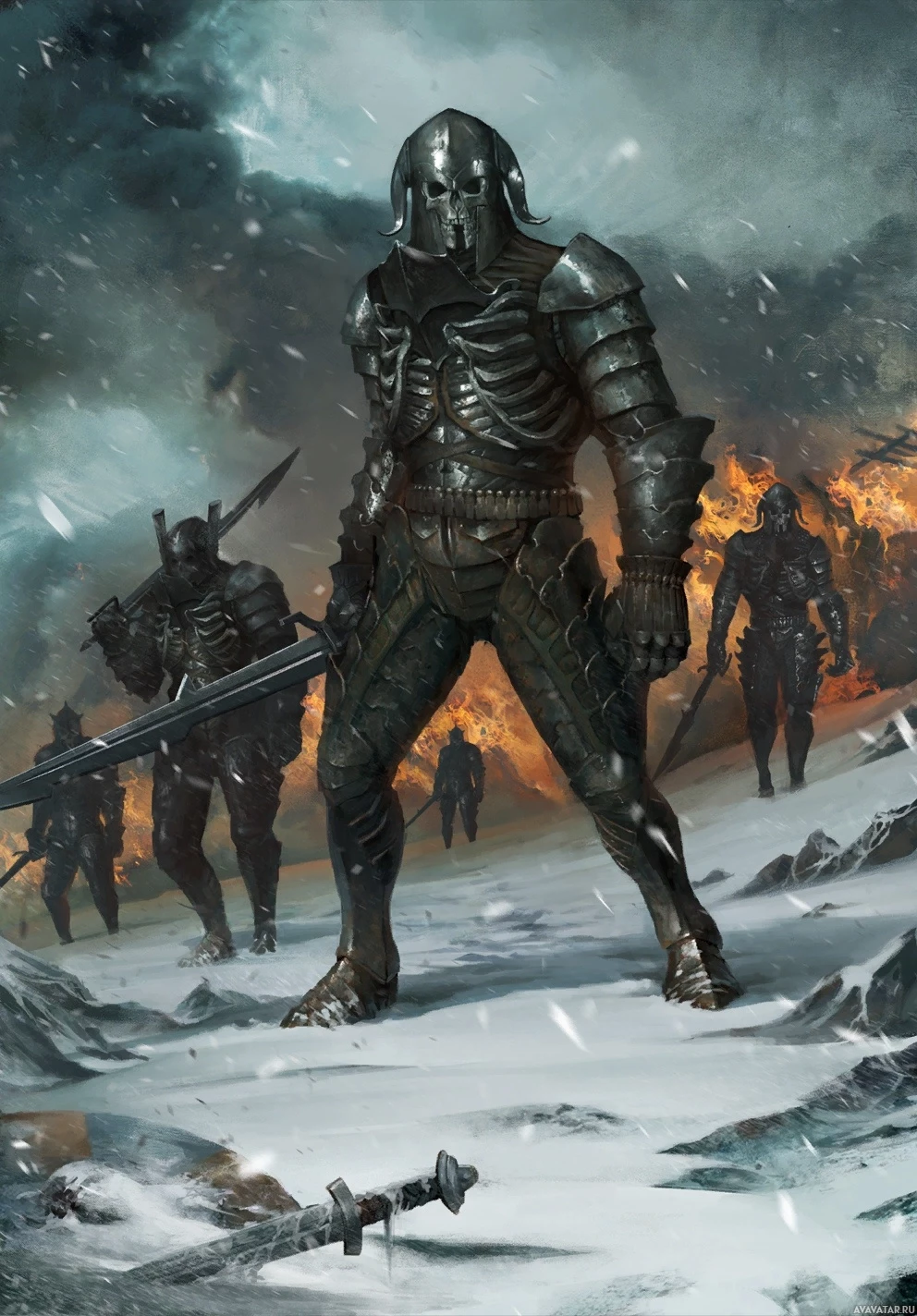 a suit of armor and a helmet that appears to be made from skulls or bones, suggesting they might be a Witcher, which are warriors known for their skills in combat and their ability to hunt monsters. The setting appears to be wintry with snow on the ground, indicating
