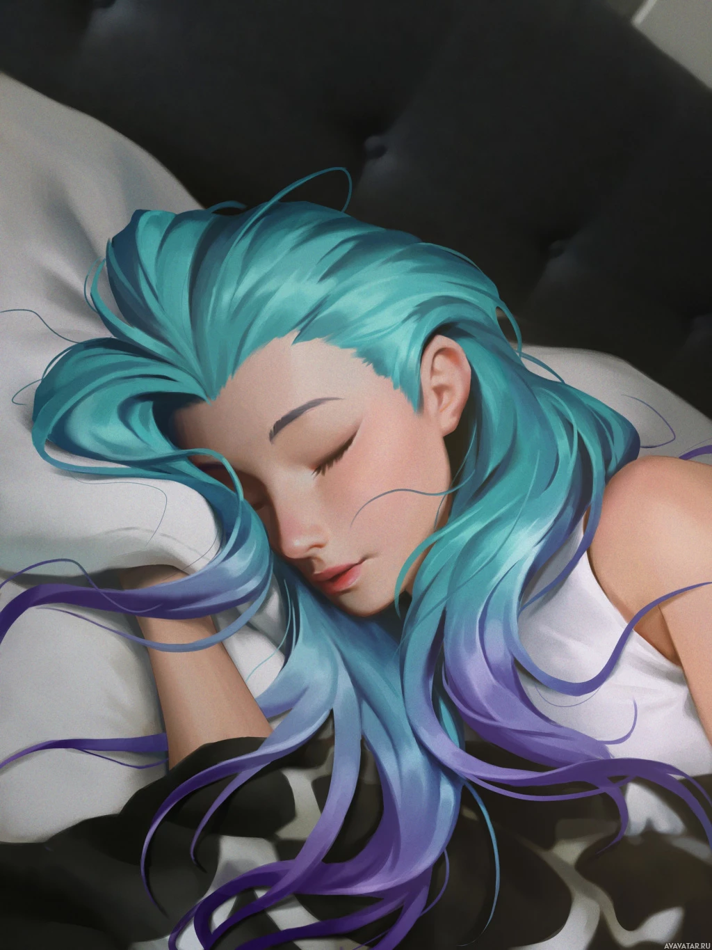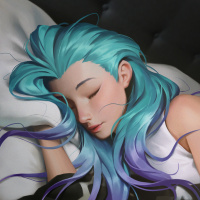 На картинке изображен анимационный персонаж в виде девушки с бирюзовыми волосами. Она изображена спящей, с закрытыми глазами, лежащей на подушке. Судя по выражению ее лица, она мирно дремлет. Персонаж, похоже, взят с иллюстрации в стиле фэнтези или аниме.
