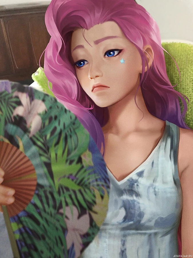 pink hair, wearing a tank top, and holding what appears to be a magazine or book. She has
