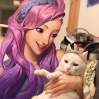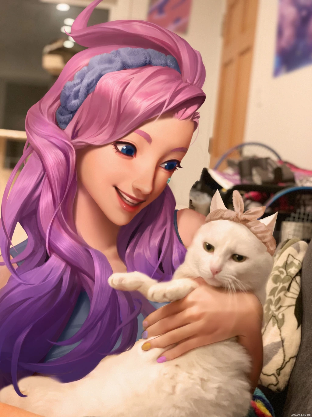 На картинке изображен персонаж с розовыми волосами, держащий на руках кошку. На девушке фиолетовые аксессуары, и на ее лице радостное выражение, когда она смотрит на кошку, которую гладит. На заднем плане изображена комната, которая придает сцене домашний уют.