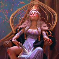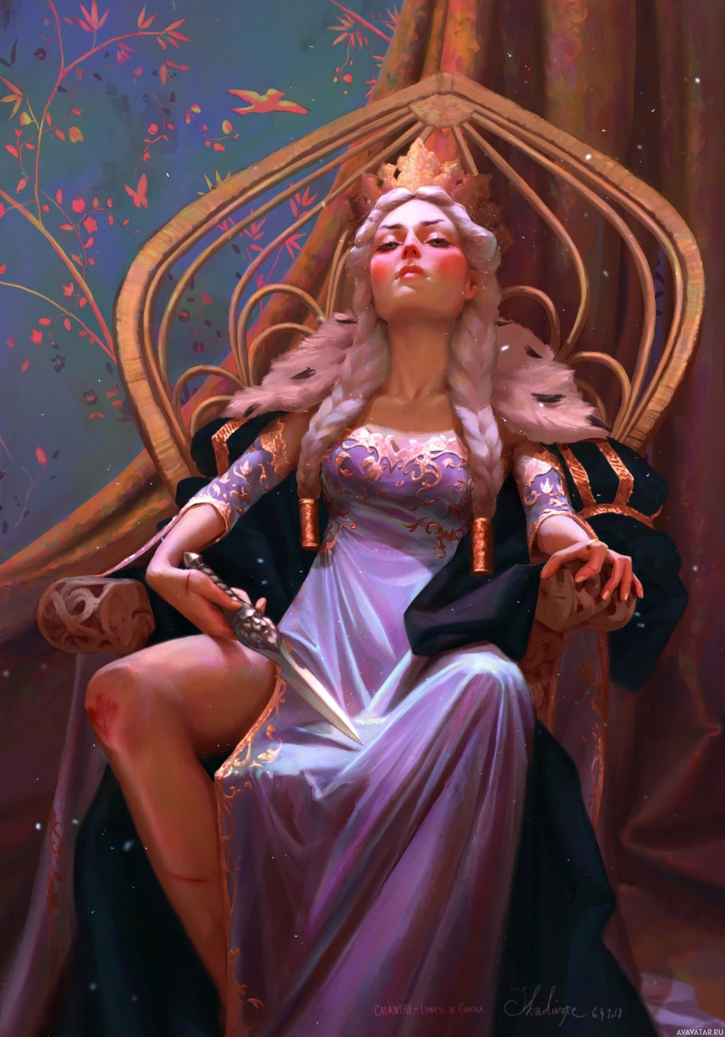 a female character with white hair. She is seated on a throne, suggesting she may be a queen or royalty of some kind. The character is holding a sword in her hand and is dressed in what appears to be