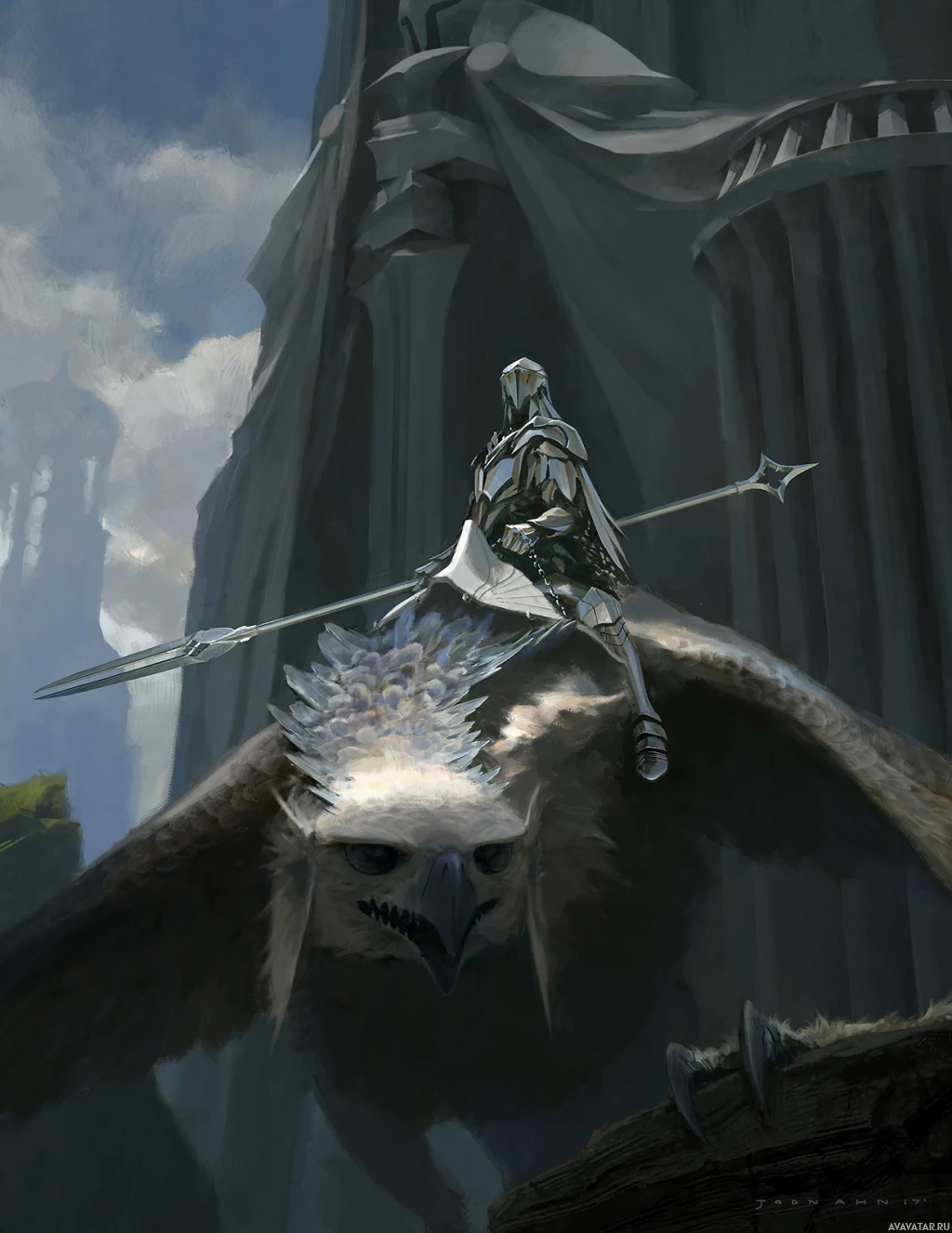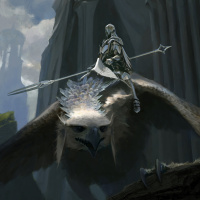a fantasy scene featuring a warrior riding atop a griffon. The warrior is equipped with a lance and wears armor, suggesting they are prepared for battle or an adventure. The setting appears to be a rugged landscape with