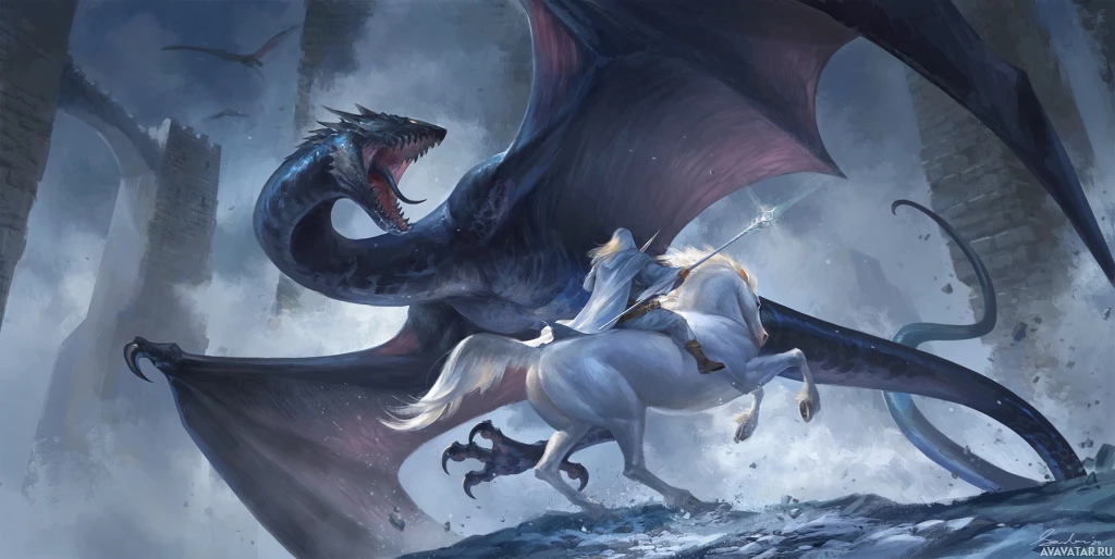 На картинке изображена фантастическая сцена, в которой рыцарь, скорее всего, всадник, противостоит виверне или подвергается нападению с ее стороны. Обстановка выглядит туманной, что, возможно, указывает на битву в мистическом или заколдованном лесу.
