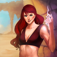 The image shows an illustration of a female character with red hair. She appears to be in a dynamic pose, suggesting movement or action. The background has a desert-like appearance with ruins and sandy ground. The style of the artwork is reminiscent of fantasy or video game aesthetics.