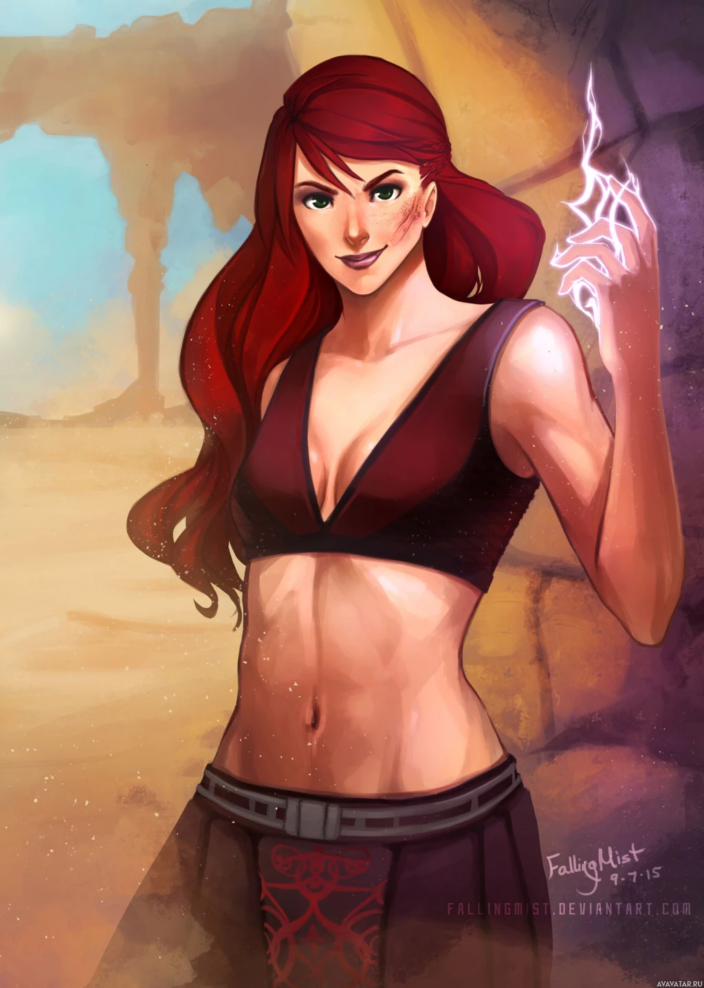 На картинке изображен персонаж женского пола с рыжими волосами. Кажется, что она стоит в динамичной позе, предполагающей движение или действие. На заднем плане изображена пустыня с руинами и песчаной почвой. Стиль иллюстрации напоминает фэнтези или эстетику видеоигр.