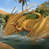 palm trees and rocky formations suggesting a warm climate. This image is likely part of a fantasy-themed artwork or illustration.