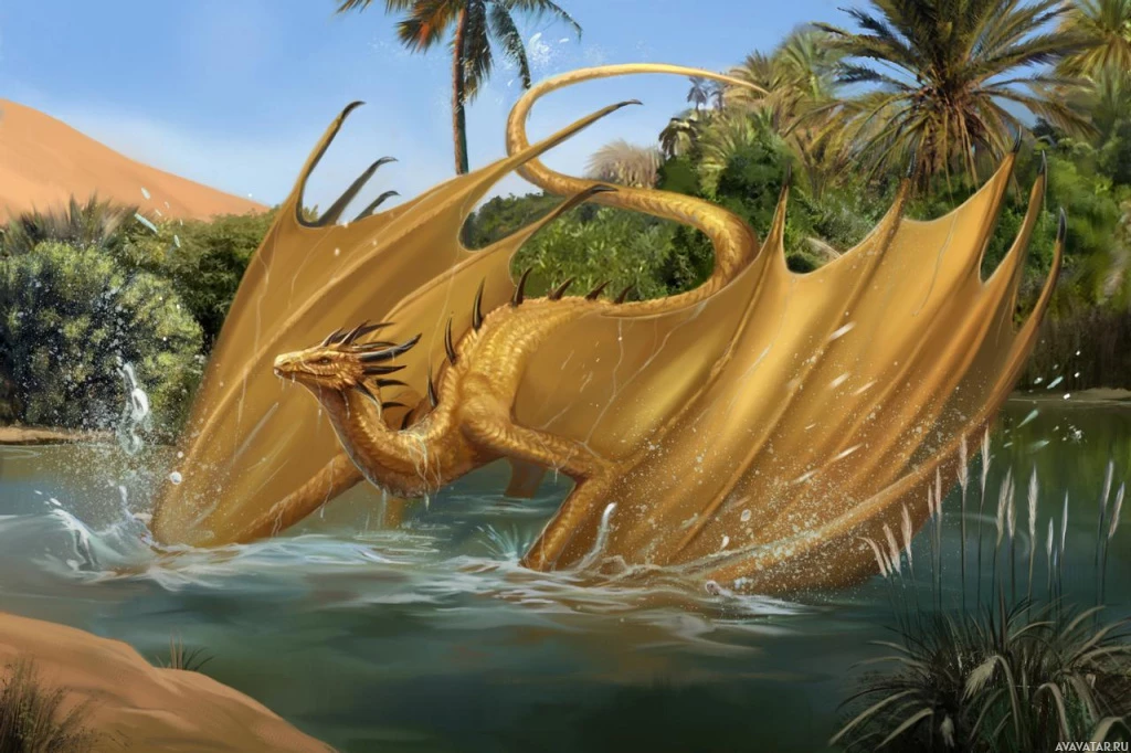 a body of water, possibly a lake or a river, given the presence of ripples and a small waterfall in the background. The environment looks like a desert oasis, with