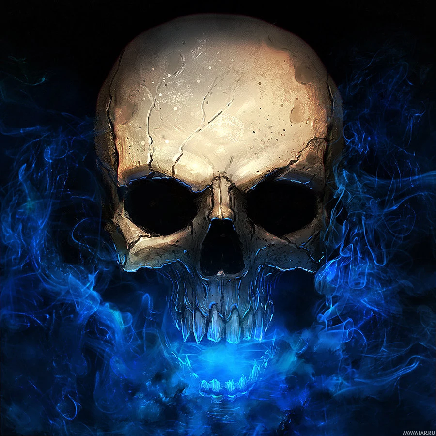 a shadowy environment or an unknown realm. Surrounding the skull are tendrils of light blue smoke or mist, creating