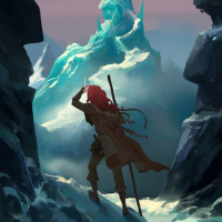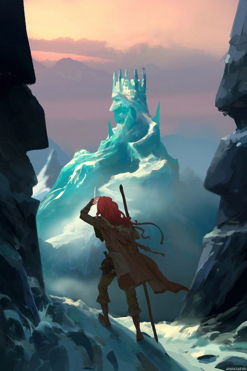 На картинке сзади изображен анимационный персонаж, который выглядит как женщина с рыжими волосами. Она стоит на обледенелых скалах и, кажется, смотрит вдаль на сооружение, похожее на замок, или ледяную скульптуру. Обстановка предполагает холодную, возможно, фантастическую обстановку.