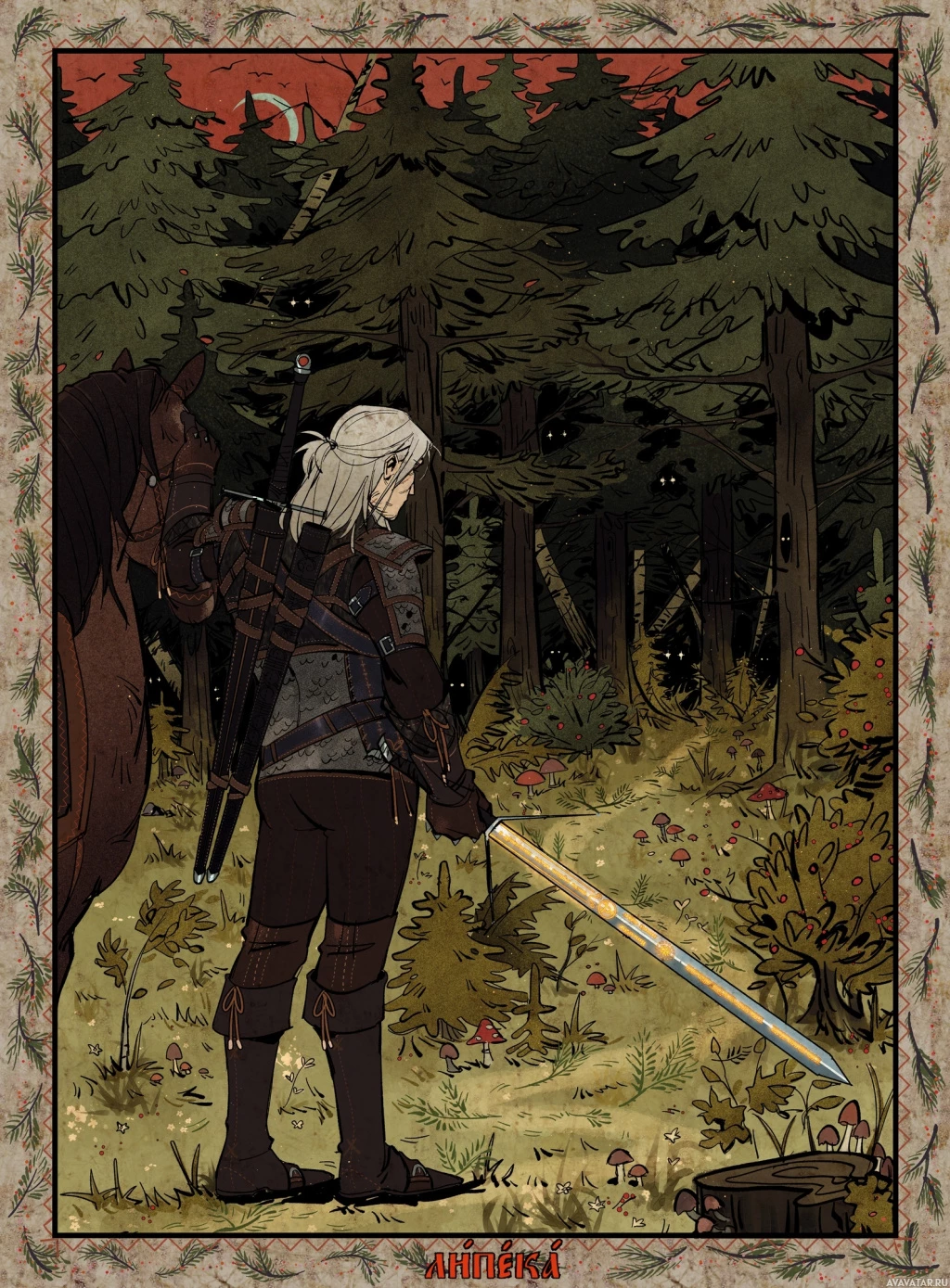 На этом снимке изображен Геральт из Ривии, персонаж серии видеоигр "Ведьмак". Рисунок богат деталями и цветом, на нем Геральт изображен стоящим на травянистом поле с деревьями на заднем плане. Он держит свой меч на боку и смотрит направо, создавая ощущение созерцания или предвкушения.