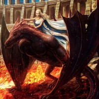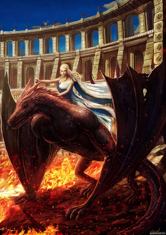 Daenerys Targaryen from the TV series "Game of Thrones," riding on the back of a large dragon amidst chaos. The dragon appears fierce and is surrounded by flames, suggesting destruction or battle. The setting looks like