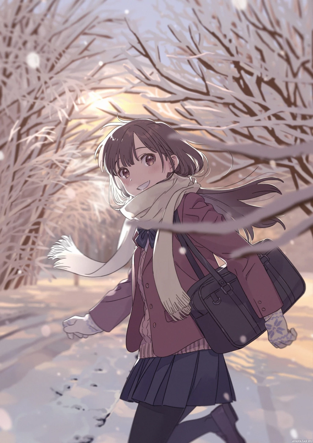 The image shows an anime-style illustration of a girl walking through what appears to be a snowy