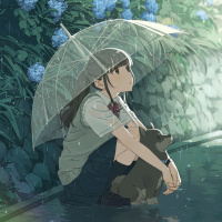 dark hair and is wearing what looks like a school uniform, implying she might be a student. The atmosphere of the scene suggests a moment of tranquility or reflection during or after rain.