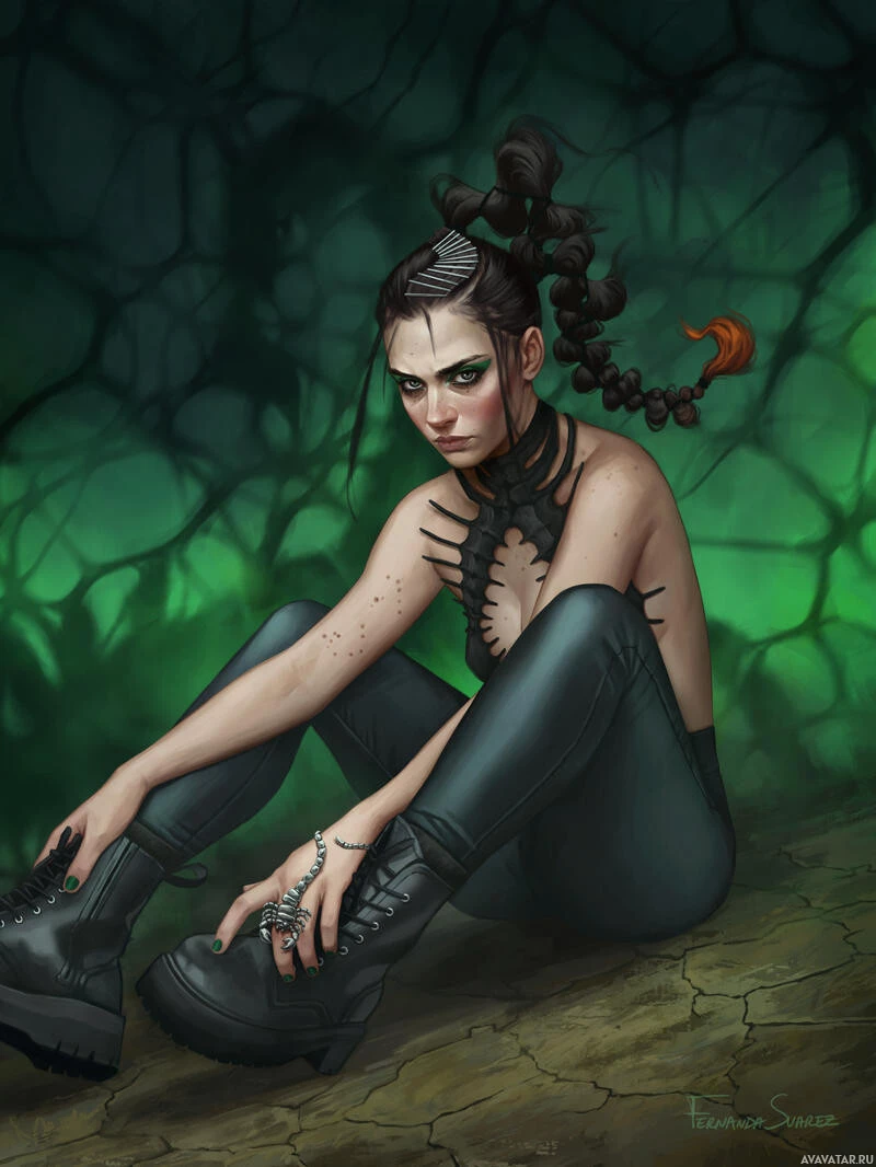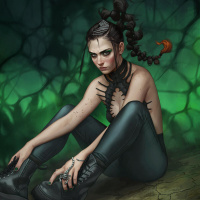 animal ears, which adds to her edgy and fantasy-like appearance. The setting appears to be a dark, mossy environment with