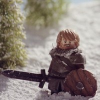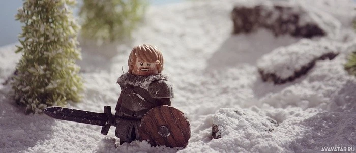 In the image, there is a Lego figure of a warrior standing amidst what appears to be