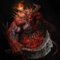 The image depicts a fantasy-themed character that appears to be a demon. This creature is muscular and has horns, a spiky tail, and